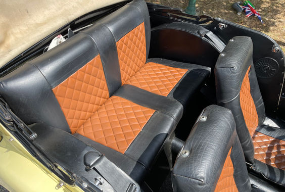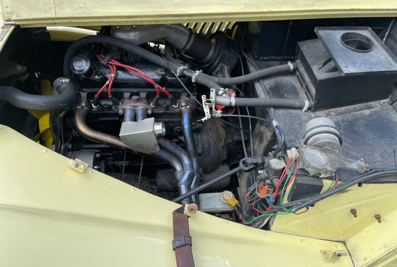 Tourer 4 places, motorisée par le Ford Kent 1600 GT. Mécanique sans défaut ni fuite, boîte 4 rapports verrouillant chaque rapport sans accroc. Châssis et trains roulants sains, sans corrosion. Peinture d'origine Primrose Yellow en très bel état, chromes comme neufs. Intérieur d'origine irréprochable, volant Moto-Lita. Complète : 4 side-screens, capote, tonneau-cover, malle de voyage. Deux concours d'élégance remportés.