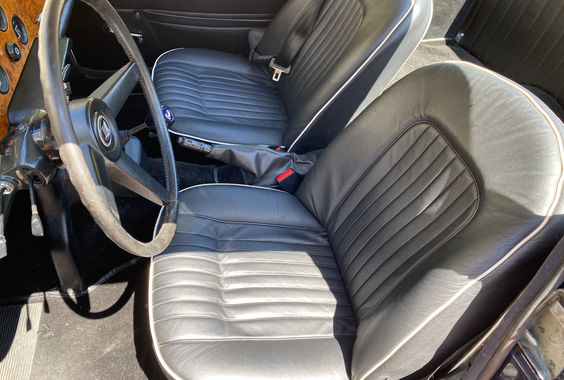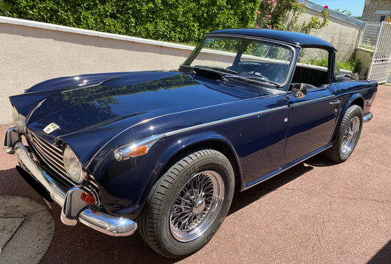 Injection Lucas, 150 ch, overdrive et Hard-Top Surrey d'origine. Livrée neuve en France en 1968. Plus de 35 000 € investis en 15 ans chez Jacques Levacher, spécialiste Triumph : moteur refait, pompe Bosch, overdrive reconditionné, pont, trains roulants neufs, freins Wilwood 4 pistons, amortisseurs Koni réglables, silent-blocs polyuréthane. Peinture Royal Blue impeccable. Jantes à rayons chromées, sièges cuir.